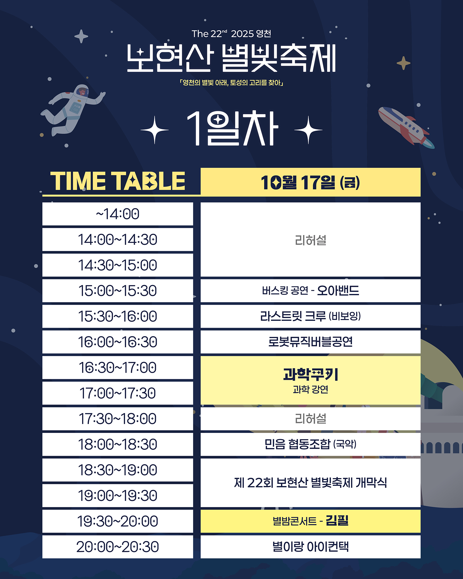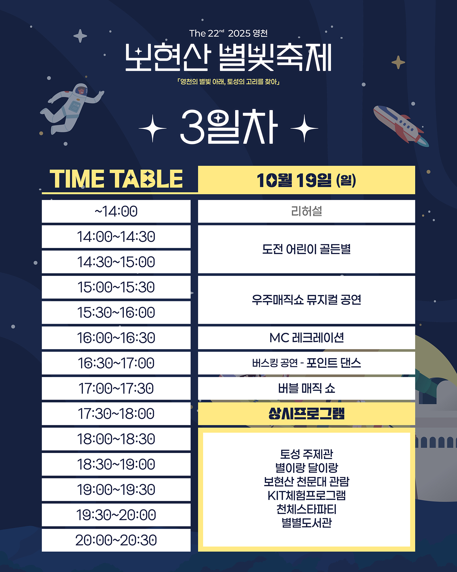 축제 기간 동안에는 보현산천문대의 대형 망원경이 일반에 개방되고, 천문 체험과 과학 교육, 예술 공연까지 함께 펼쳐진다.