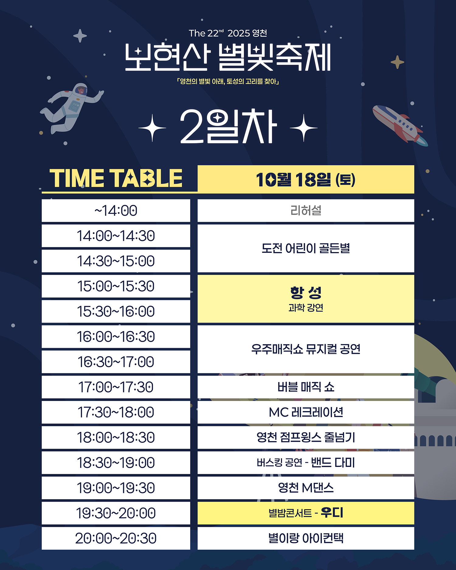올해(2025년)는 “영천의 별빛 아래, 토성의 고리를 찾아”라는 주제로, 과학과 감성이 어우러진 프로그램이 준비되어 있다.